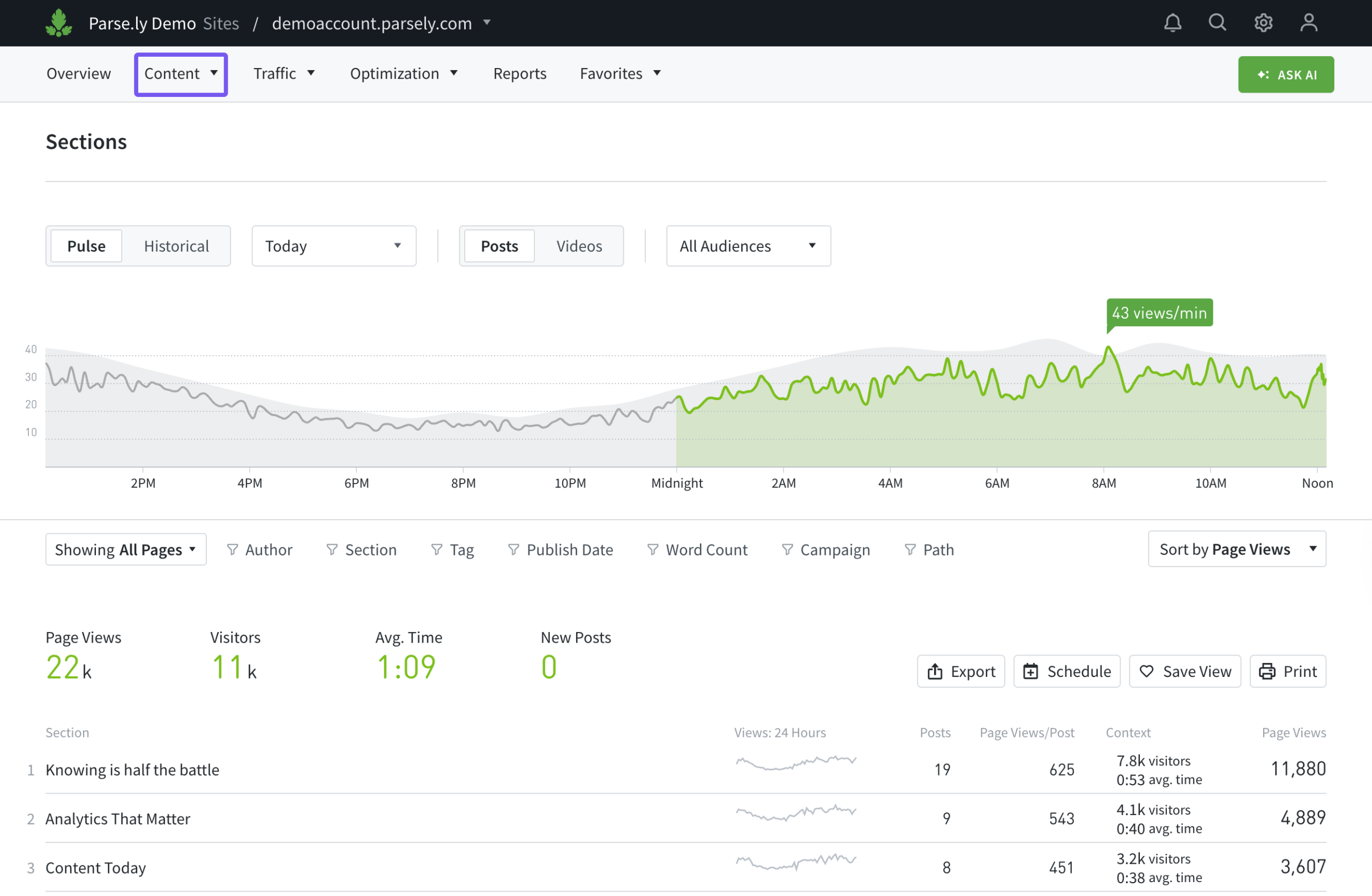 The sections page of the Parse.ly Dashboard typically focuses on top-level site navigation areas. For example, if readers can find content on a site under Politics, Business, Finance, Local, etc., Sections displays performance separated by these areas. You can find the sections page in the content menu of the navigation bar.