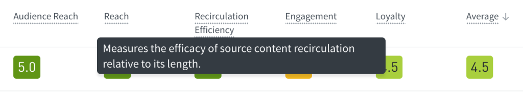 For Recirculation Efficiency, posts without word count metadata receive a score of 1.0 due to insufficient data. Ensure metadata is properly configured through the site’s Parse.ly integration.