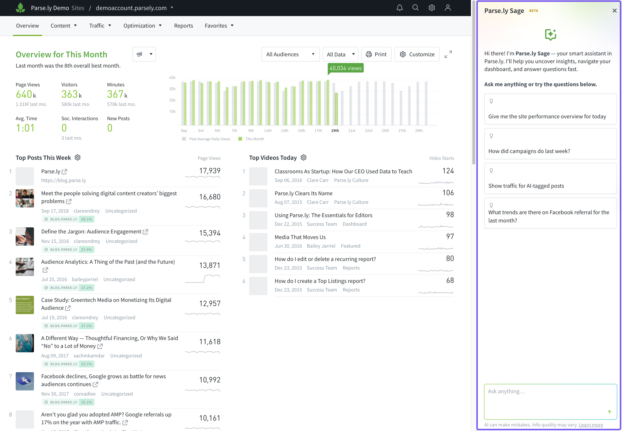 - Find insights faster: Instead of clicking through multiple tabs or building complex filters, simply ask Parse.ly Sage a question like, “Which articles drove the most page views yesterday?” It provides the correct answer, plus takes you straight to the relevant tab in the Dashboard.