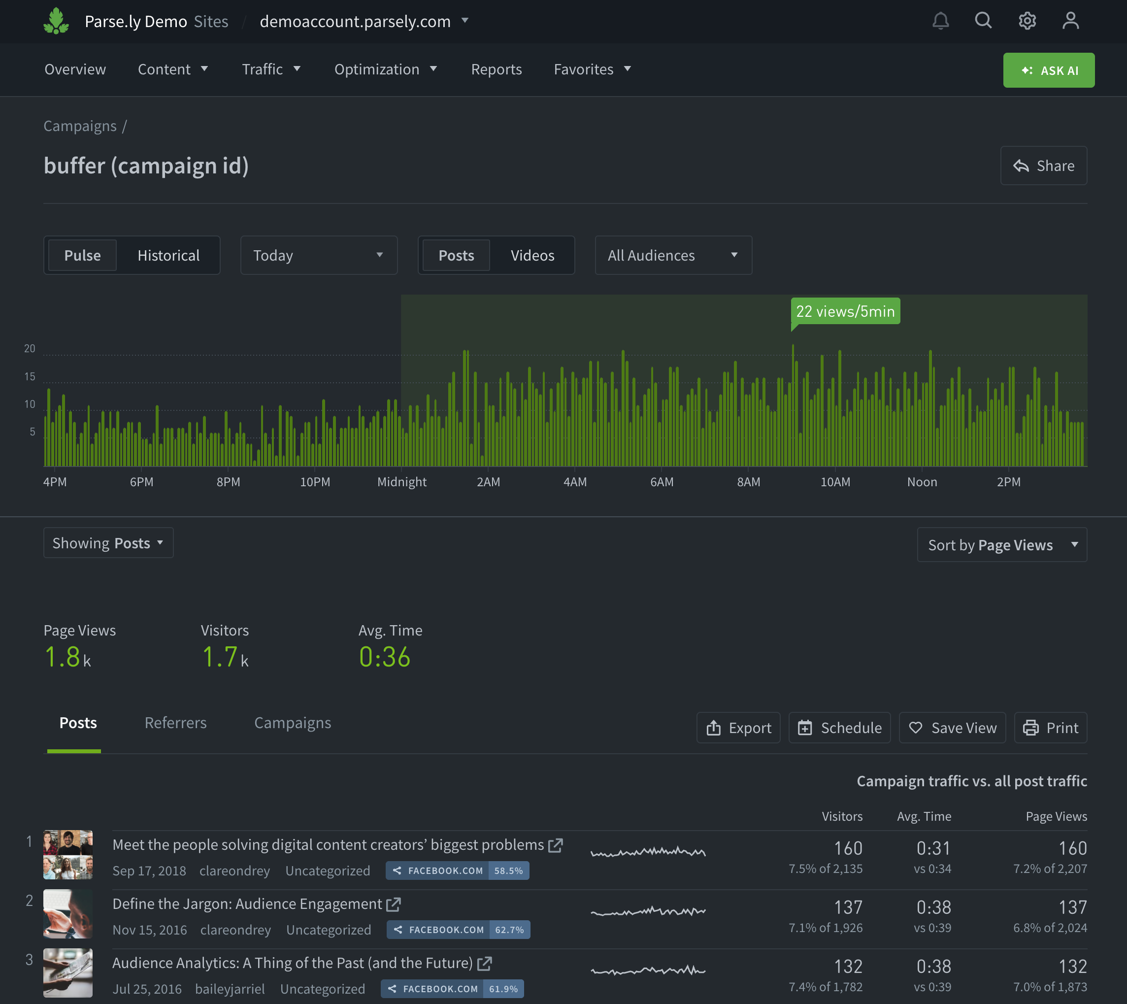 The campaign details page allows you to evaluate audience engagement with a single campaign, medium, source, piece of content, or term in conjunction with related posts, videos, referrers, and other campaign aspects.