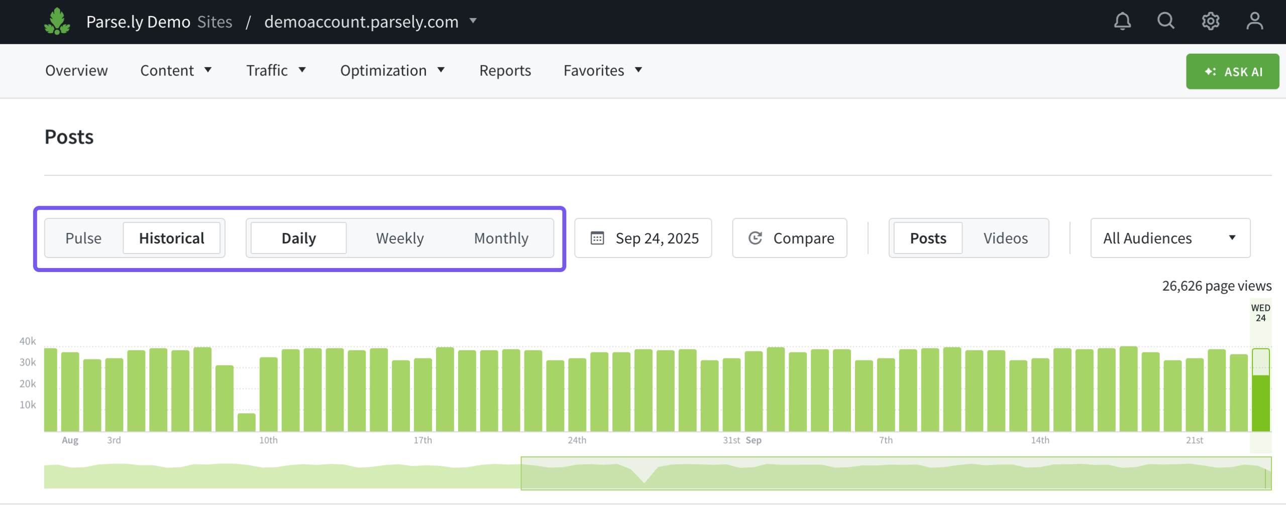 When viewing the Dashboard in Historical mode, a date range can be selected using the calendar icon or by clicking and dragging a date range on the bar graph. If selecting 31 days or fewer, this displays comparison bars beneath factoids of the relative change between the current factoids and the average of previous data. For deeper comparisons, use Parse.ly’s Comparison Mode and Benchmarks.