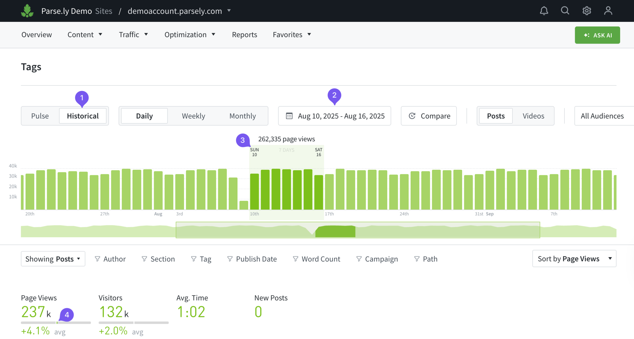 Timelines seen in the Overview tab and other Dashboard tabs (Posts/Pages, Authors, Sections, etc.) show data comparisons and projections. For deeper comparisons, use Parse.ly’s Comparison Mode and Benchmarks.