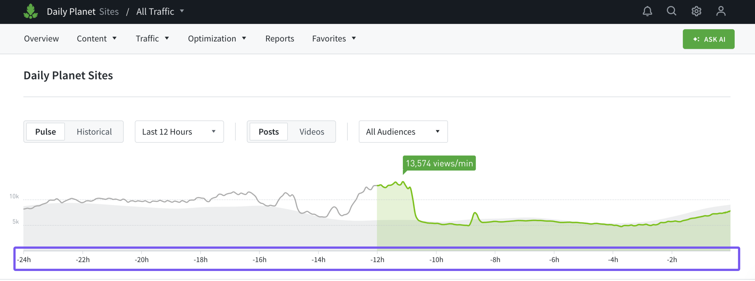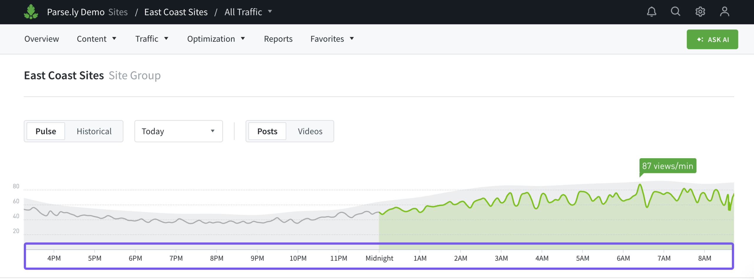 When viewing Network Rollup or a site group in the Dashboard, the line graph in the Pulse view will display specific hours on its x-axis when all sites in the group or network share the same time zone.