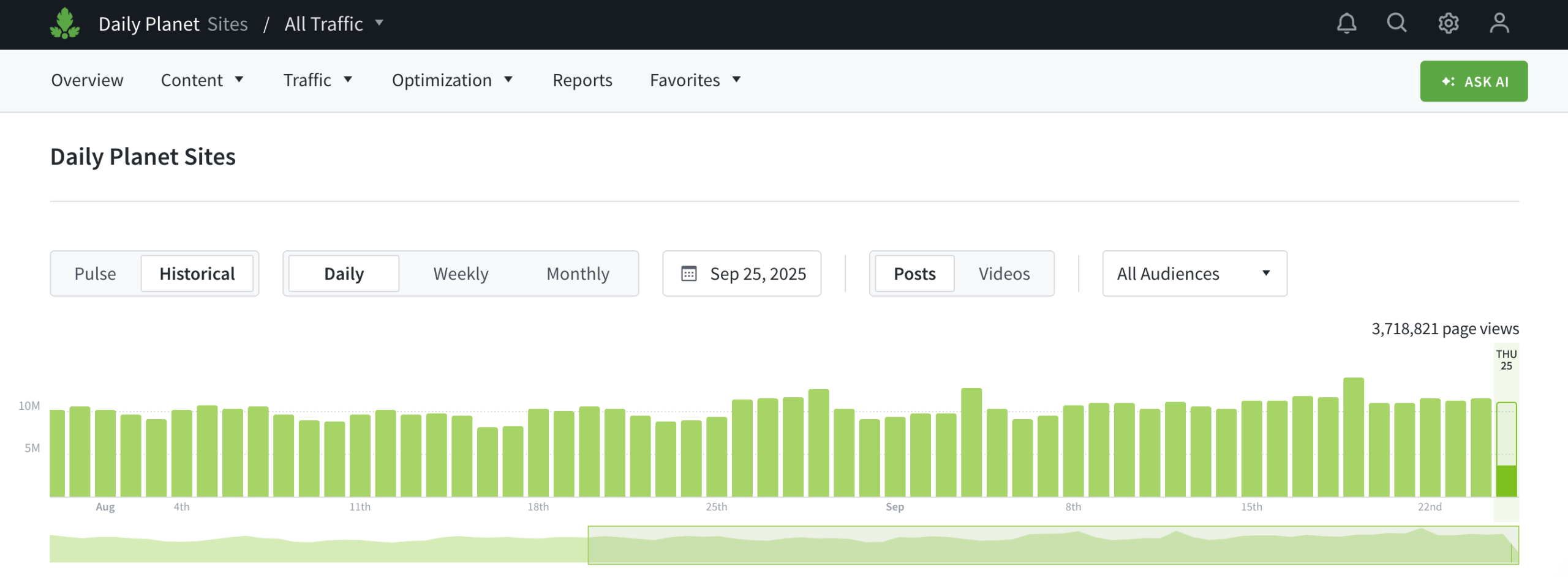 When viewing daily traffic in the Historical view for a site group or network with different time zones, each day’s traffic is calculated from 24 hours of data, midnight to midnight, in each site’s respective time zone.