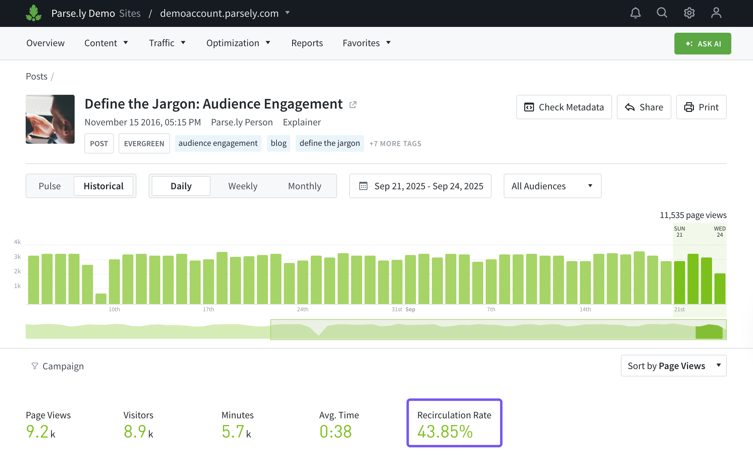 Recirculation rate is seen on the Posts tab of the Parse.ly Dashboard and individual post details pages.
