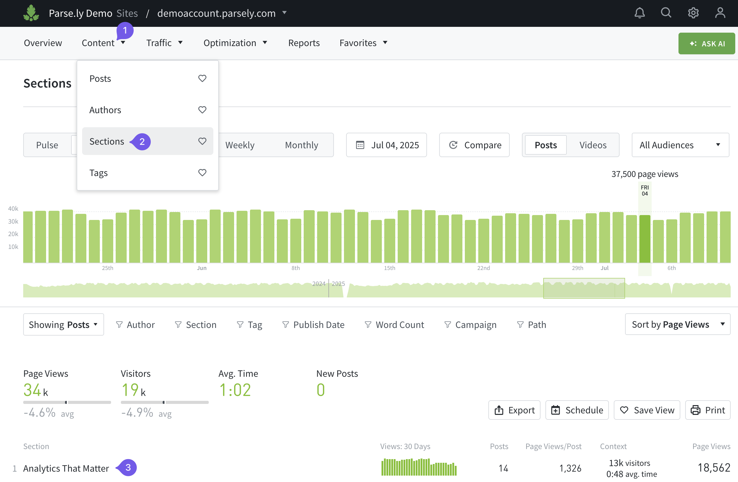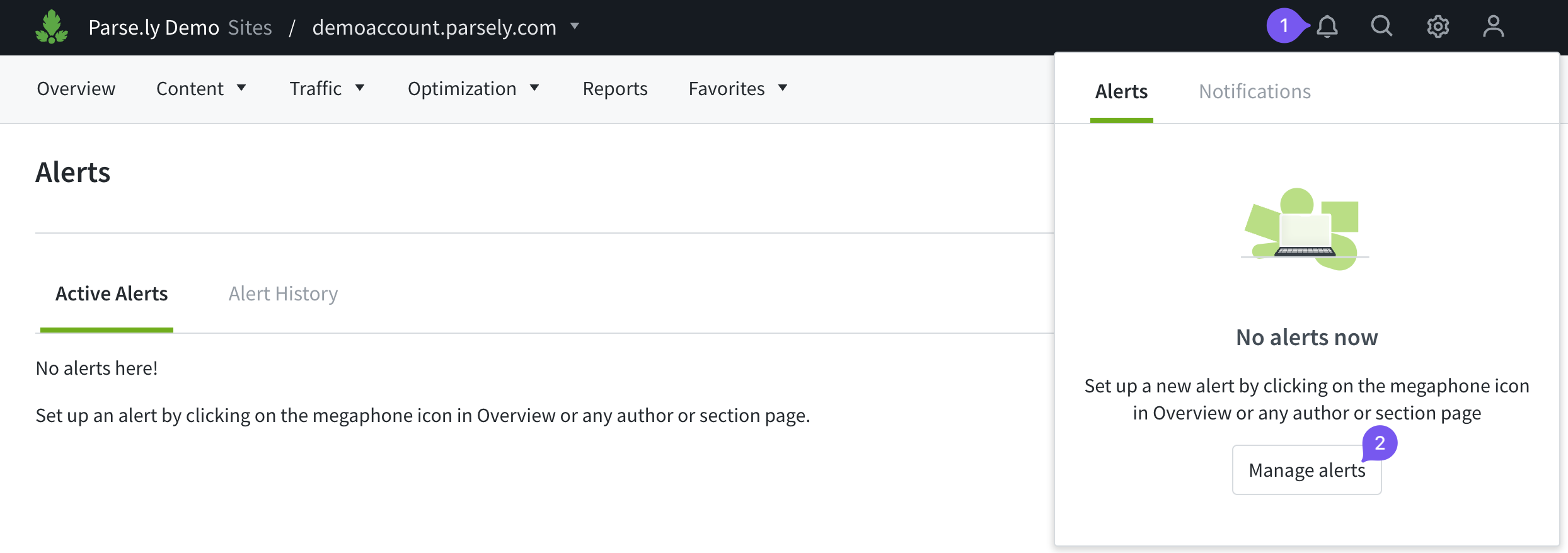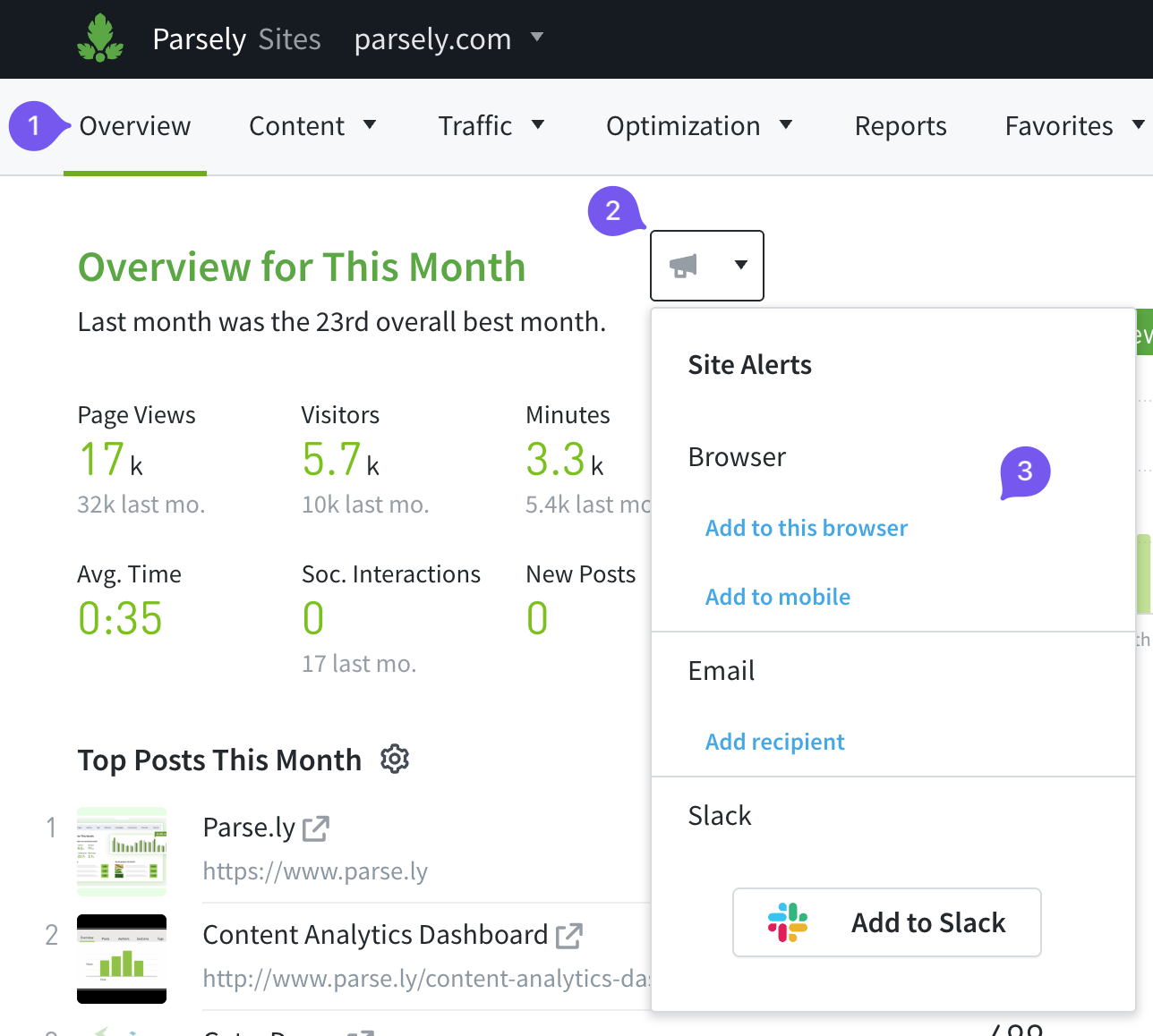 - Visit the Overview tab of the Parse.ly Dashboard.