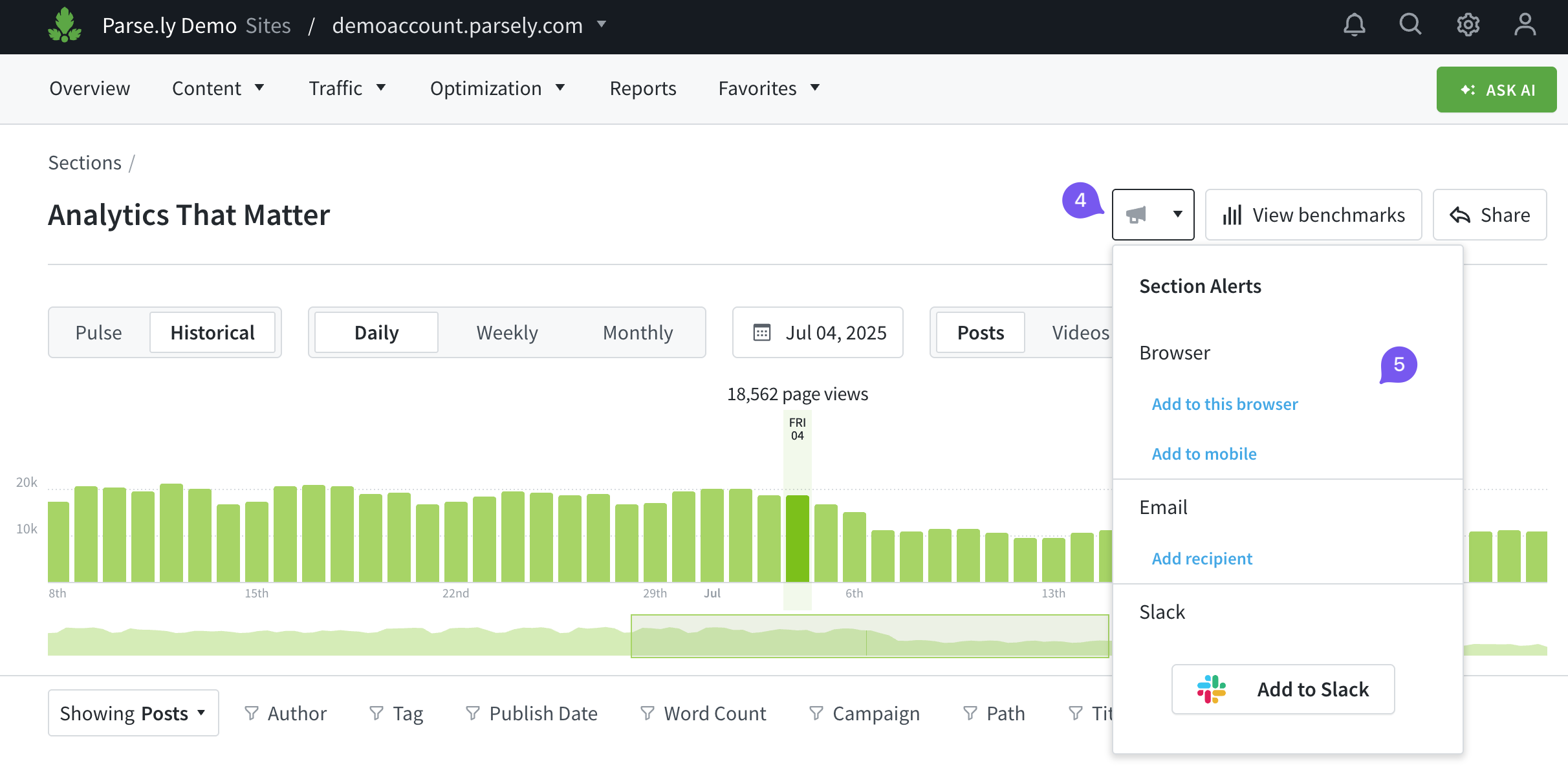 Parse.ly alerts help you stay informed when posts receive significantly more page views than usual. Alerts can be received via desktop or mobile browser, Slack, or email.