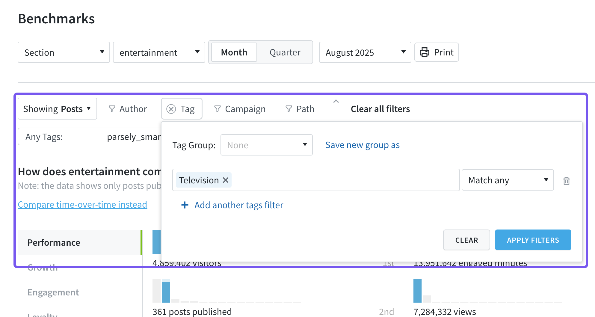 You can easily visit a different author, section, or tag’s benchmarks page using the drop-down menus. Toggle between “Month” and “Quarter,” then choose a specific time period (e.g., July 2025, 2025 Q3).