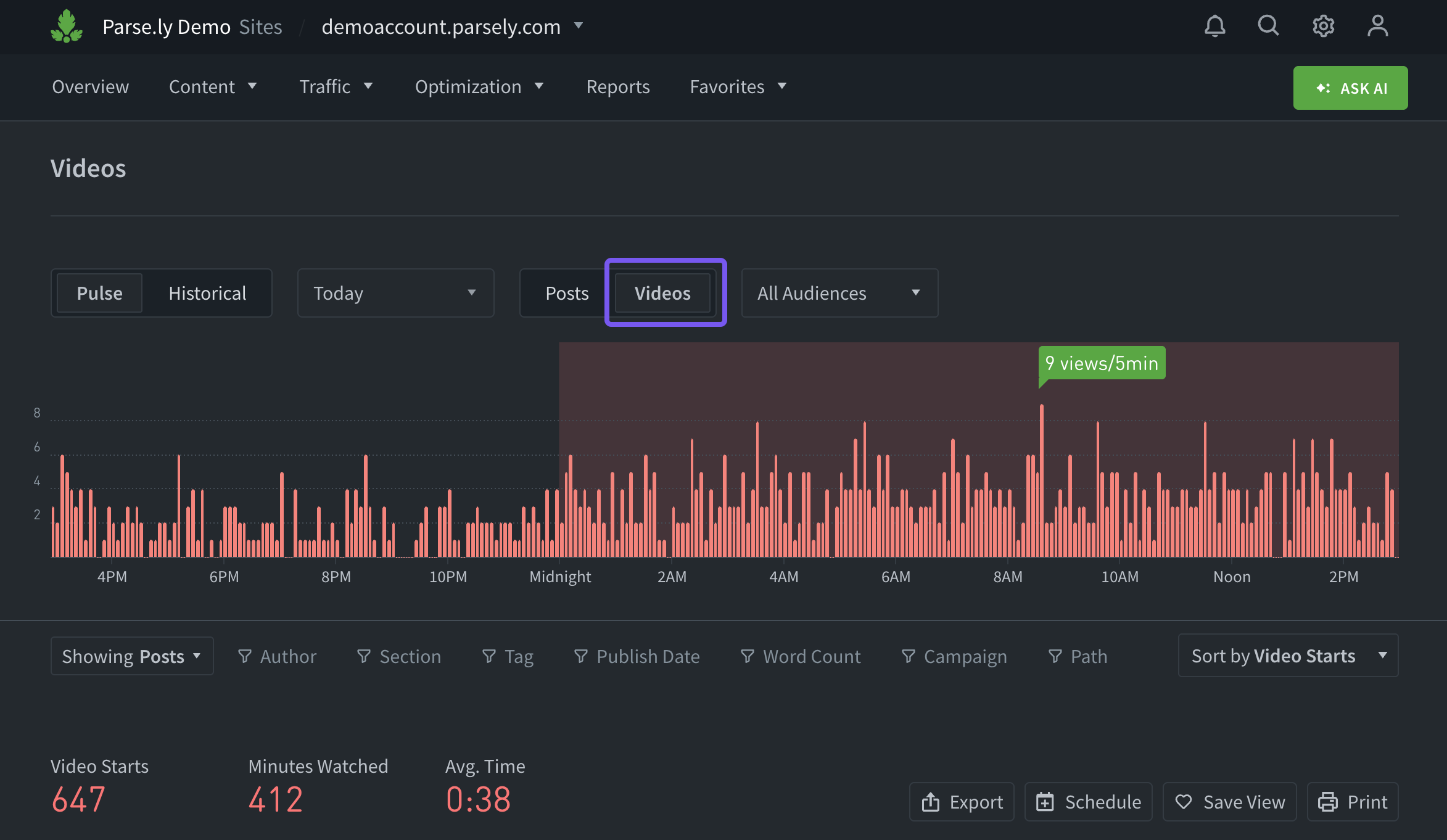 Parse.ly’s Video Tracking brings video metrics into the Parse.ly Dashboard, including video starts, visitors (video-specific), total minutes watched, and average watch time.