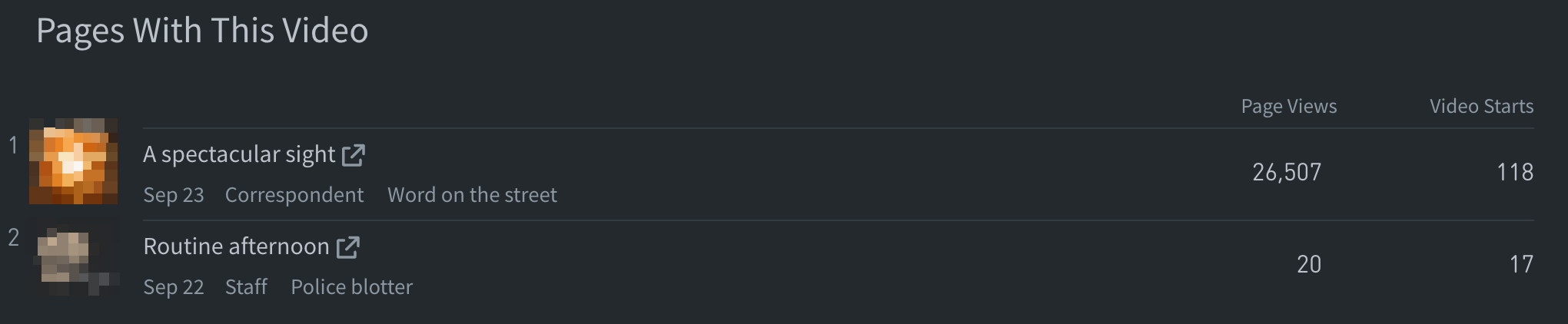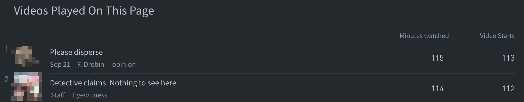 When Video Tracking is integrated, the “Videos played on this page” section is included on individual post details pages.